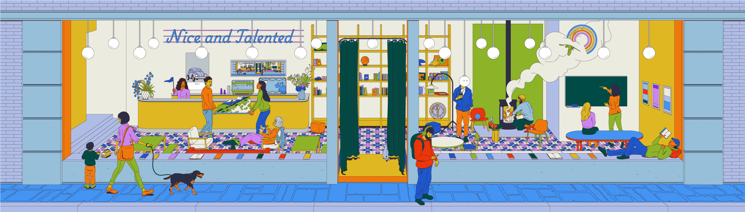 This illustration depicts a beautiful and playful lobby in the 17th arrondissement of Paris, filled with various real and surreal scenes that could, would, or should happen on their workdays.